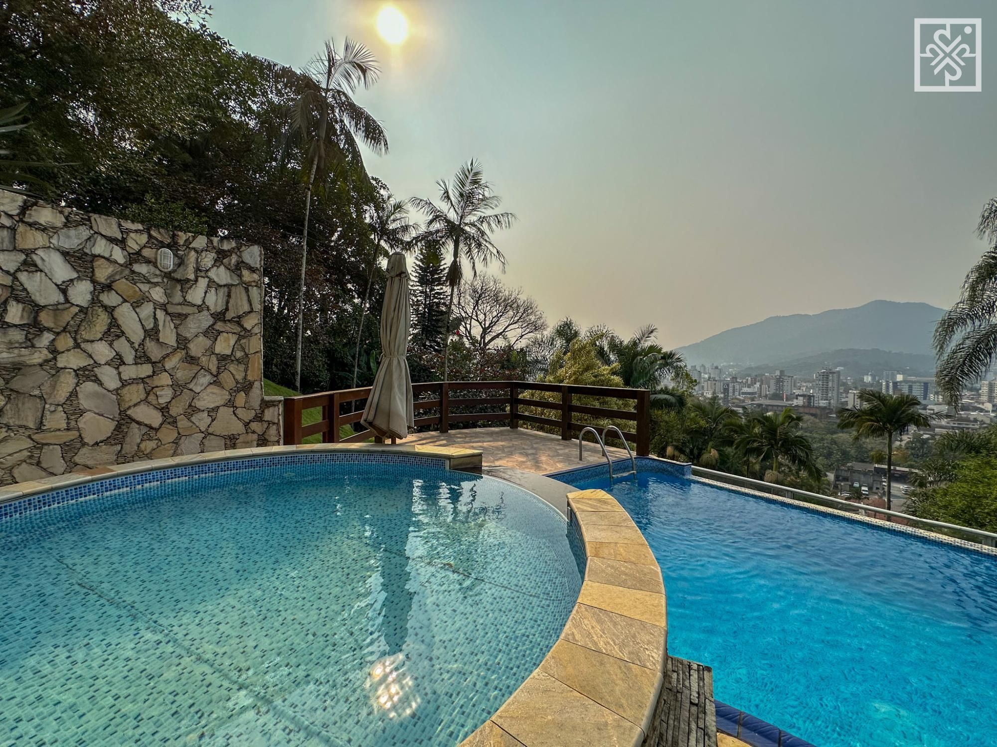 • Piscina de borda infinita com cascata, criando uma atmosfera relaxante